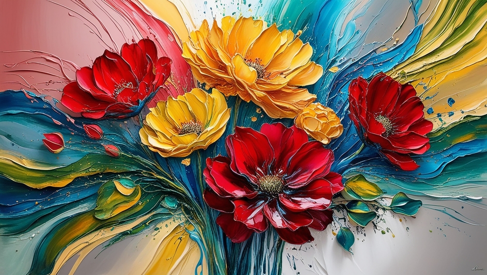 Each design celebrates the beauty of flowers in a unique, imaginative style 🌼, where colors swirl and collide to evoke joy, growth, and transformation. From vivid reds and yellows to tranquil blues and greens, the interplay of hues is a feast for the eyes and soul. The textured layers and flowing forms mimic the natural grace of petals while pushing the boundaries of contemporary art trends.